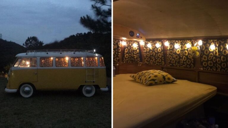 Para aproveitar o local com mais conforto, a Kombi motorhome custa R$ 150, com diária de 24h. O veículo é equipado com colchão, entrada USB, mini geladeira, mesa com cadeiras, churrasqueira e fogueira privativa.