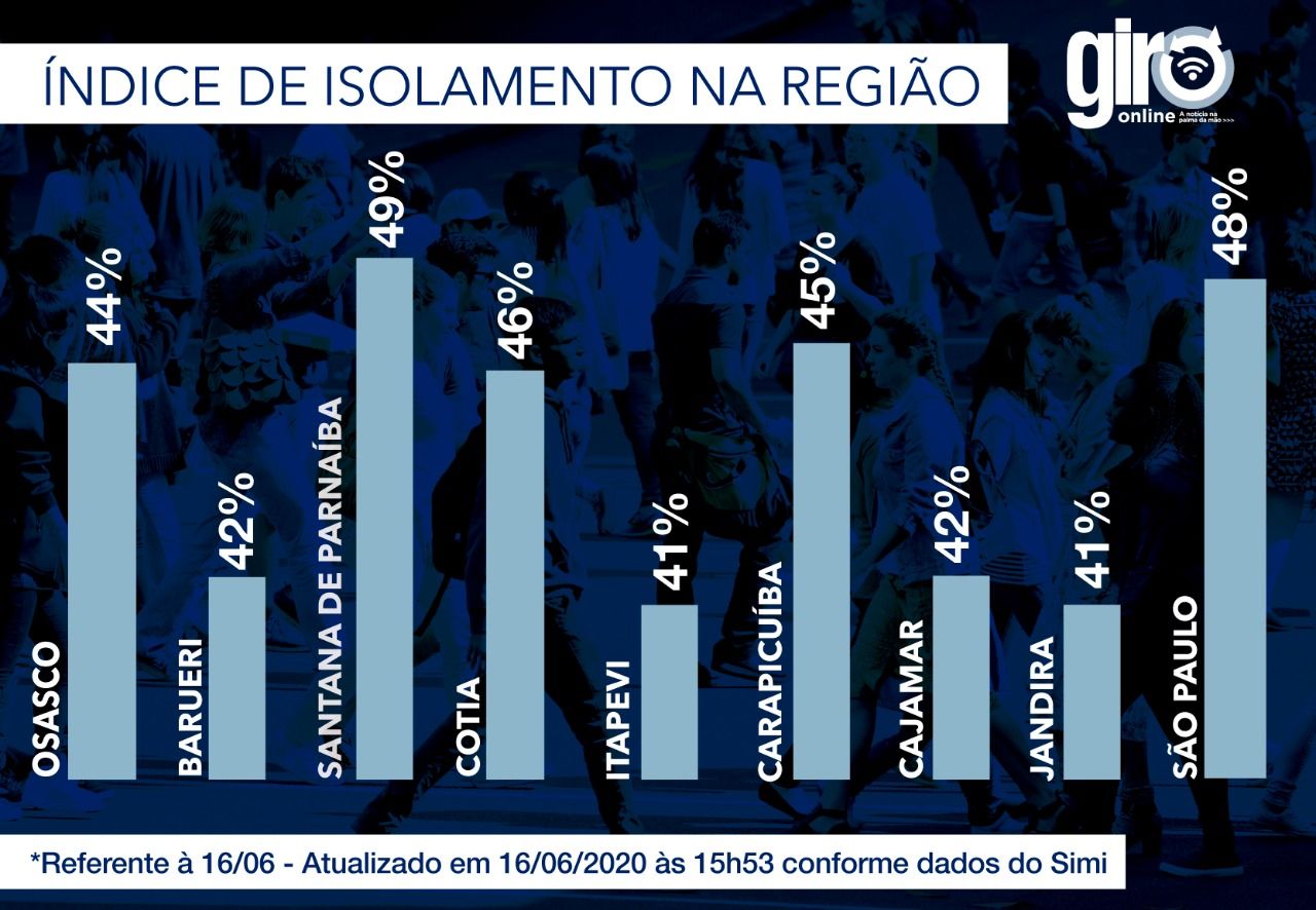 Santana de Parnaíba alcançou 49%, mesmo taxa da segunda-feira e vem se mantendo nessa média, entre as vinte melhores do Estado. As demais cidades também vêm mantendo a média de isolamento, entre 44% e 47%, durante a semana, melhorando um pouco o índice aos finais de semana, quando diminuem os deslocamentos para os locais de trabalho.