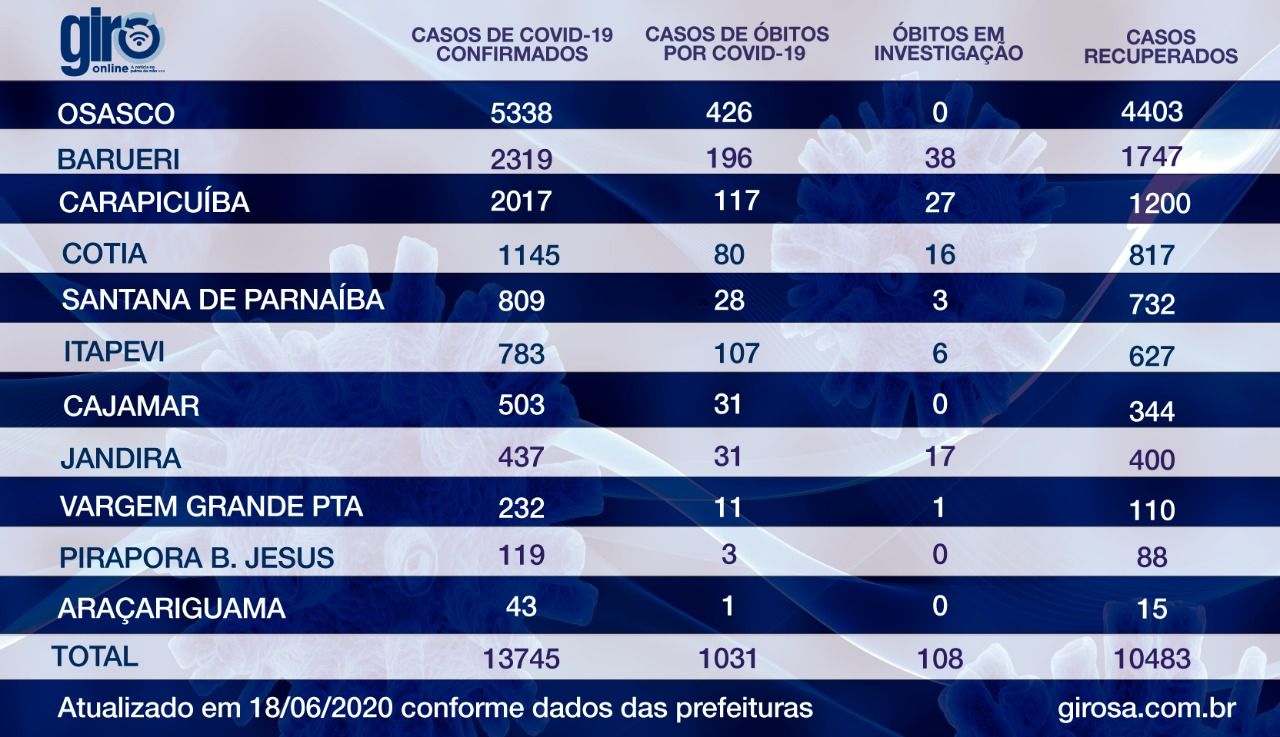 A pandemia já causou 1031 óbitos na região.Osasco é a cidade com o maior número de mortos, somando 426 óbitos. Em seguida está Barueri, com 196, Carapicuíba 117 e Itapevi com 107.