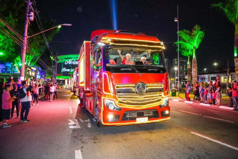 Após inaugurar a tradicional decoração natalina no último sábado (19), a cidade recebeu o comboio de caminhões luminosos, que passaram por diversos bairros com a