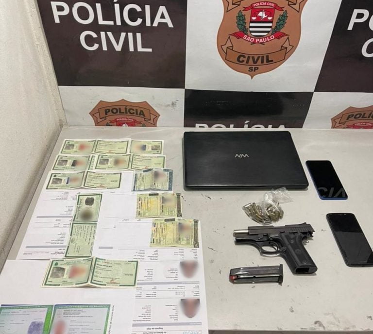Na ação, agentes da Polícia Civil também apreenderam uma arma, munições e diversas cédulas falsas que eram usadas para aplicar golpes na cidade